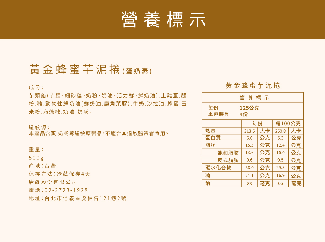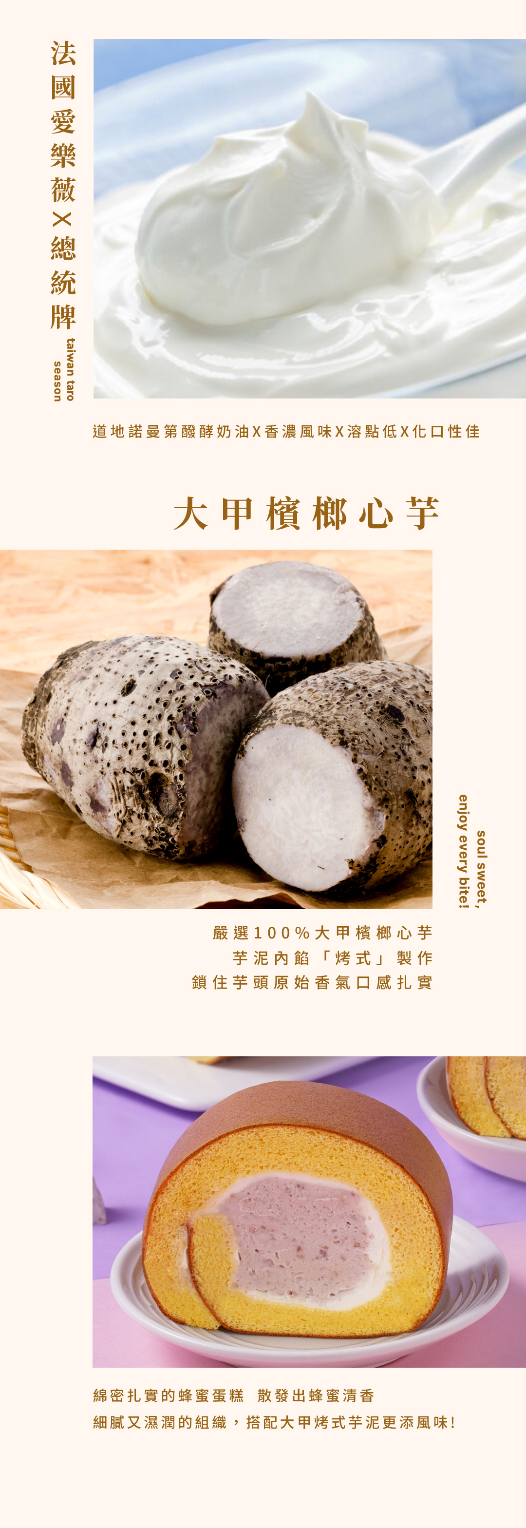 加入土雞蛋,讓蜂蜜蛋糕體味道更加升級!以嚴選大甲芋頭製成芋泥,保留些許芋頭顆粒在其中,厚厚實實的芋泥內餡,讓芋頭控為之瘋狂!