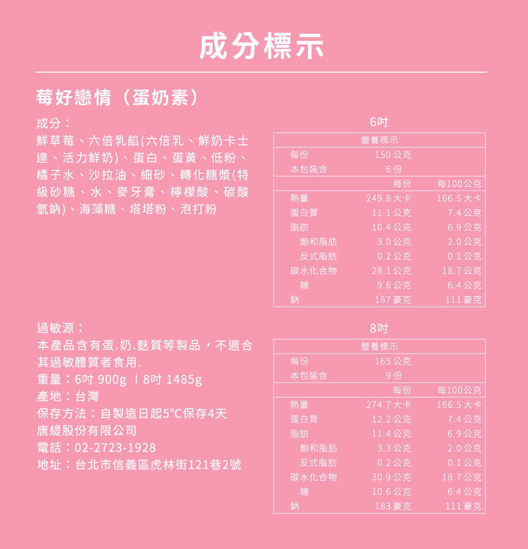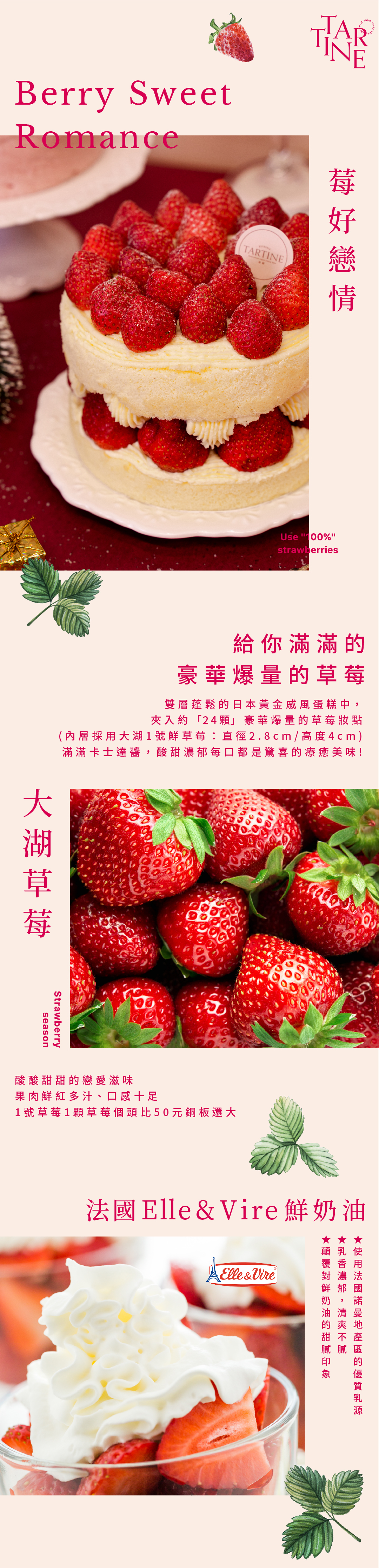 綿密蛋糕體夾入大顆大湖草莓與歐洲進口的六倍乳,酸甜莓果與濃郁奶香相互交織,滋味不膩口而清爽,每口都能吃到草莓!