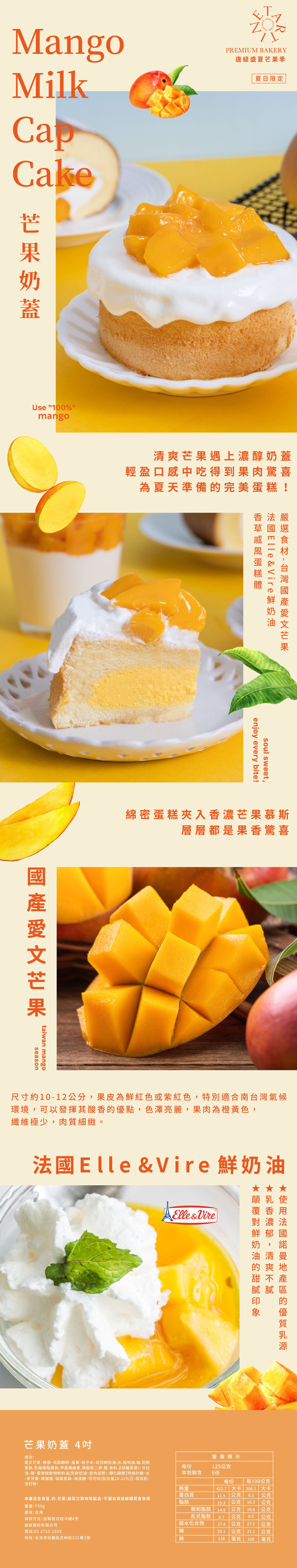 在雪白奶蓋山上,鋪上滿滿的新鮮愛文芒果丁!蛋糕體與奶蓋使用低糖配方,毫不膩口的絲滑奶蓋襯托芒果的酸甜風味,小巧4吋蛋糕最適合作午茶點心&幫好友驚喜慶生